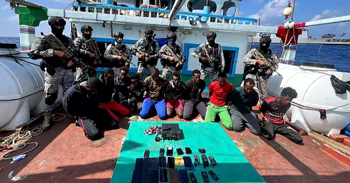 Photo released on January 30, 2024, by the Indian Navy showing a group of pirates detained after the Indian Navy freed an Iranian fishing boat hijacked by Somali pirates, off the coast of Somalia and about 850 nautical miles (approximately 1,550 km) west of the Indian city of Kochi. (Picture source: Indian Navy)