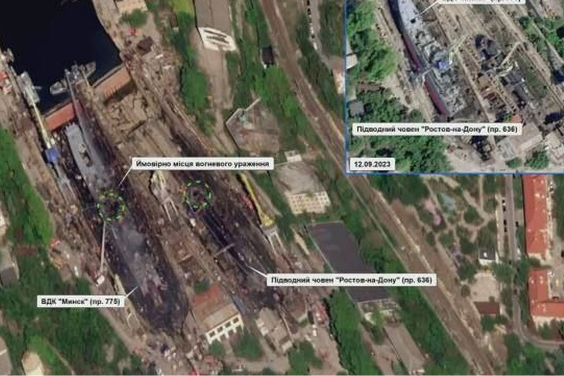 Russia's wooden submarine decoy exposed by satellite images after Rostov-on-Don sinking.