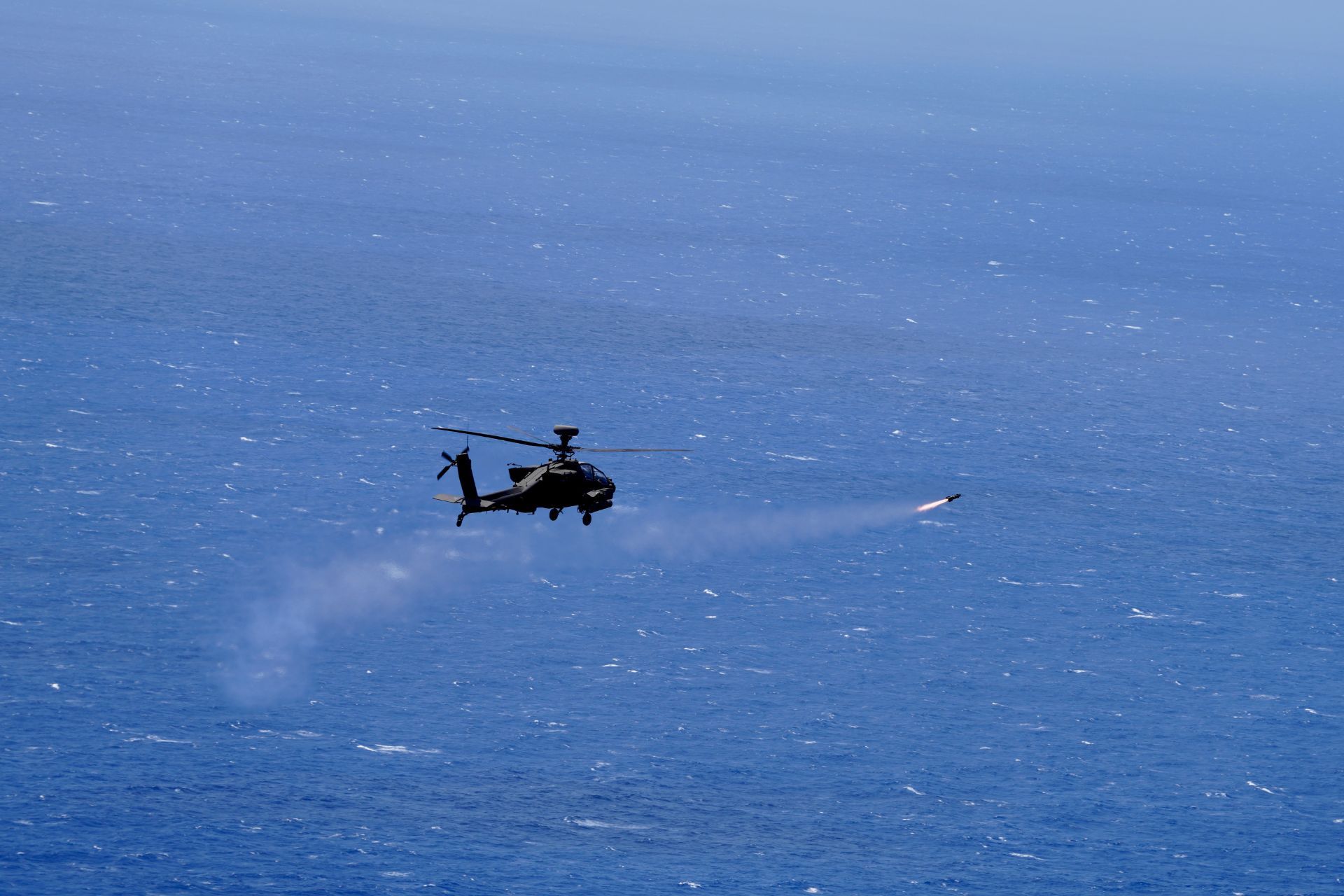 An AH-64 Apache helicopter, attached to the 2nd Battalion, fired an AGM-114 Hellfire missile at the decommissioned Austin-class amphibious transport dock, USS Dubuque, during a live-fire Sinking Exercise (SINKEX) off the coast of Kauai as part of the Rim of the Pacific (RIMPAC) 2024 exercise on July 11, 2024. (Picture source: US DoD)