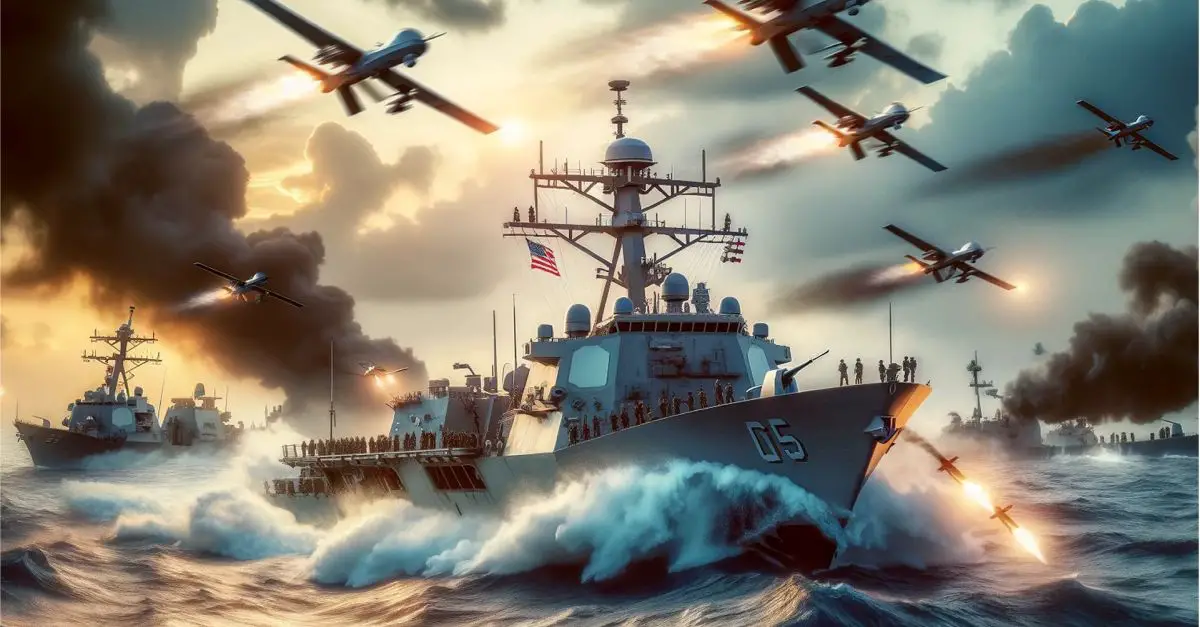 Artist rendering of a US Navy warship and Houthis Unmanned Aerial Vehicles. (Picture source: Generated by AI)