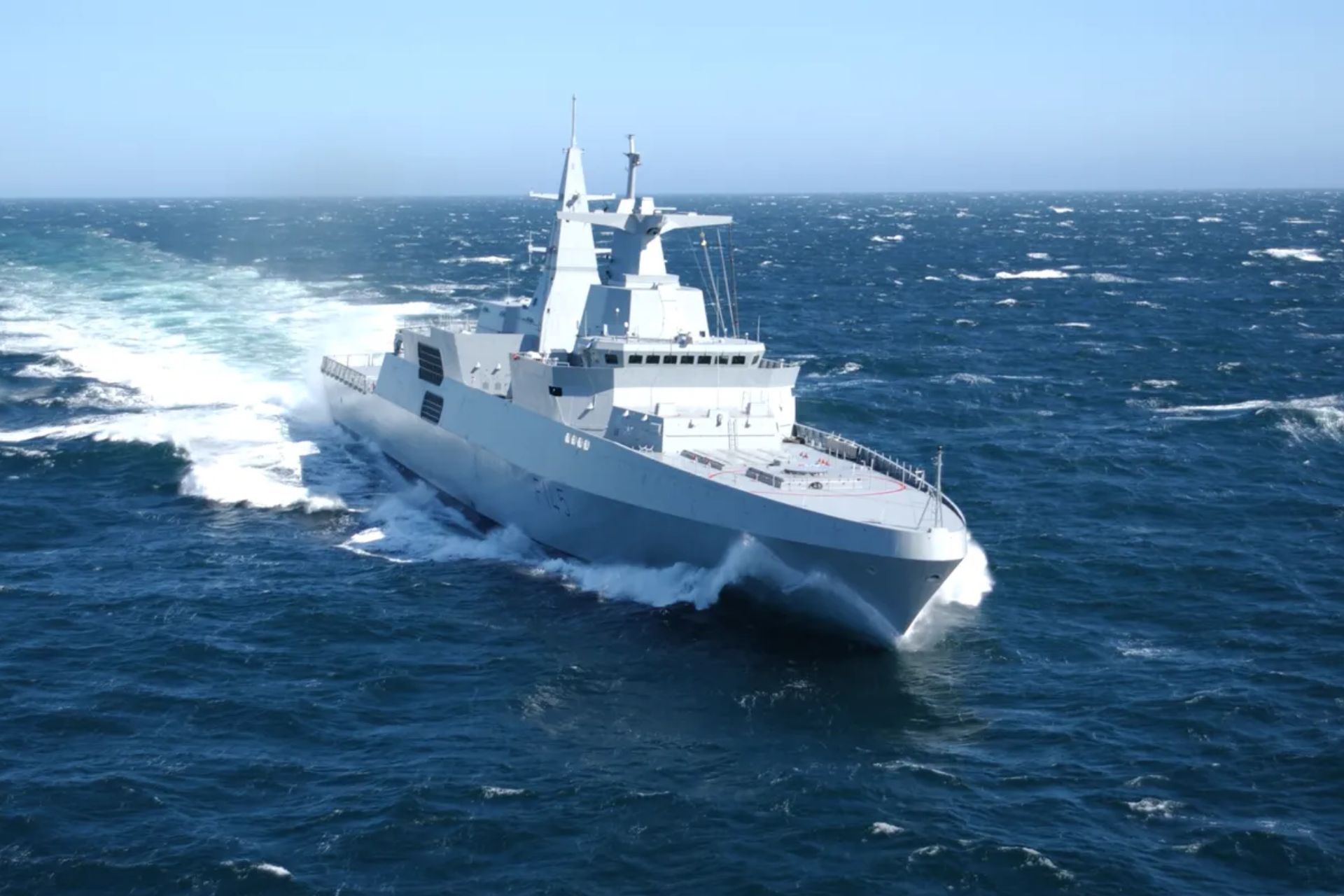 The MEKO A-200 frigate, developed by thyssenkrupp Marine Systems, is a 121-meter-long multi-mission combat vessel with a displacement of approximately 3,700 tons. It can reach a top speed of 28 knots and has an operational range of 7,200 nautical miles at 16 knots. Designed for both coastal and blue-water operations, it features a modular architecture that enables the integration of various weapon systems and sensors depending on operational requirements. Standard armament includes a 127 mm main gun, anti-ship missiles, medium-range air defense systems, and lightweight torpedoes. The frigate is also equipped with a helicopter deck and hangar, capable of supporting a naval NH90 aircraft.