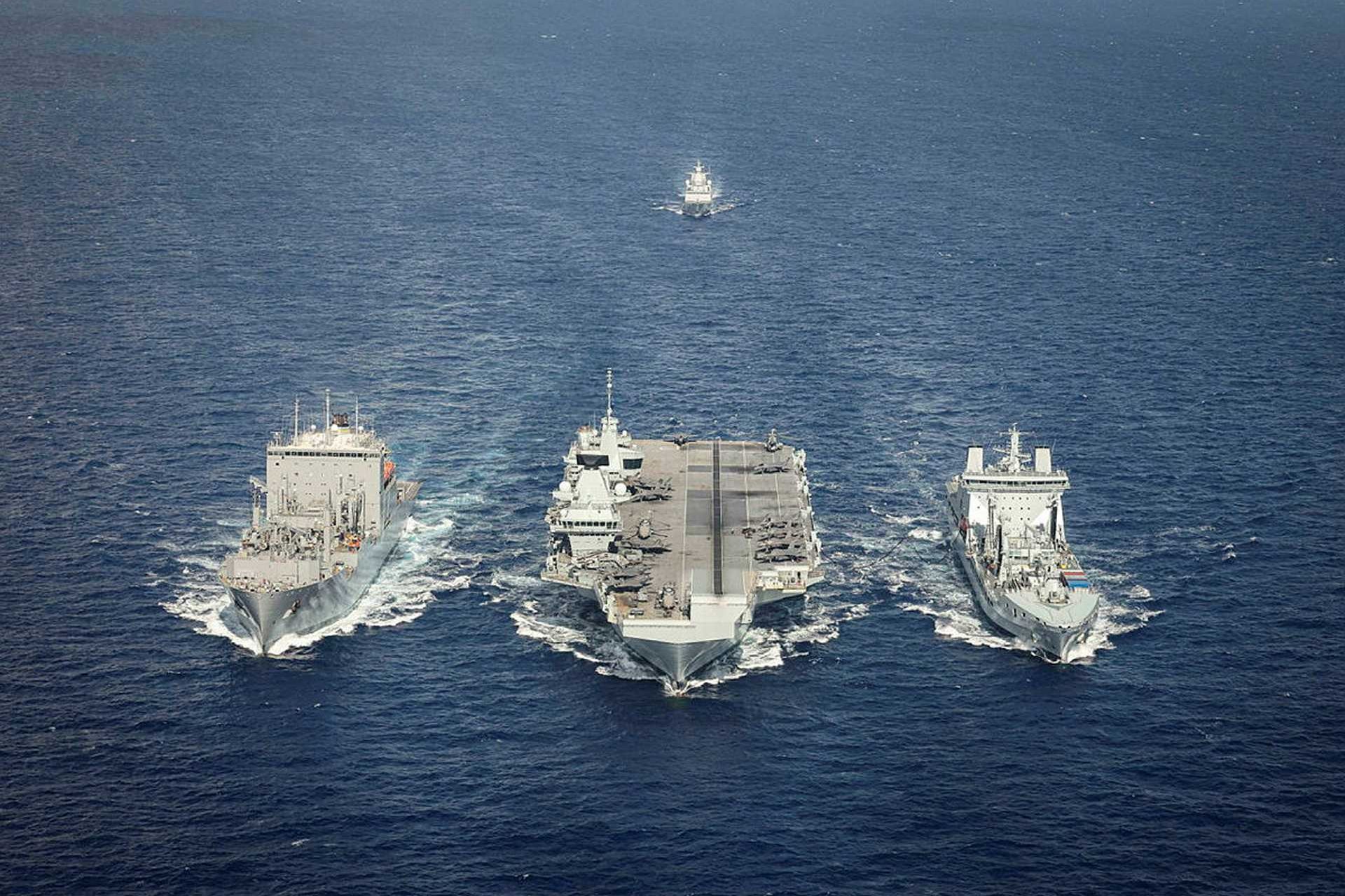 The UK’s aircraft carrier HMS Prince of Wales conducted a Replenishment at Sea (RAS) with Royal Fleet Auxiliary Tanker RFA Tidespring and the U.S. Navy’s USNS Wally Schirra. (Picture source: British MoD)