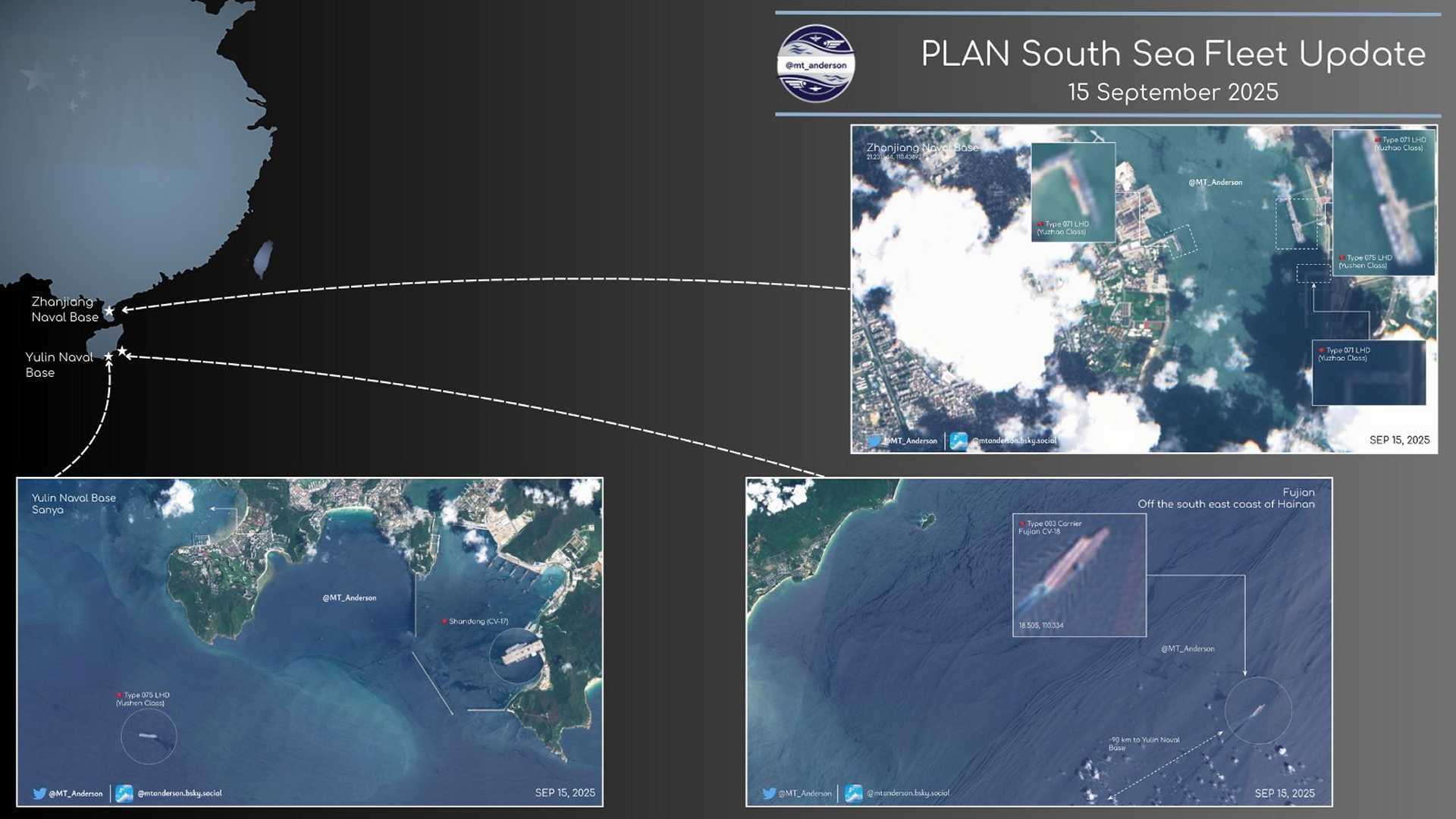 As reported by MT Anderson on September 15, 2025, recent satellite imagery revealed multiple Chinese Navy assets concentrated in the South Sea Fleet area. The aircraft carrier Shandong is pictured at Yulin Naval Base near Sanya with a Type 075 landing helicopter dock (LHD) close by. The newer carrier Fujian was observed sailing off Hainan. Zhanjiang Naval Base is reported to host a group of amphibious vessels, including three Type 071 landing platform docks (LPDs) and another Type 075 LHD.
