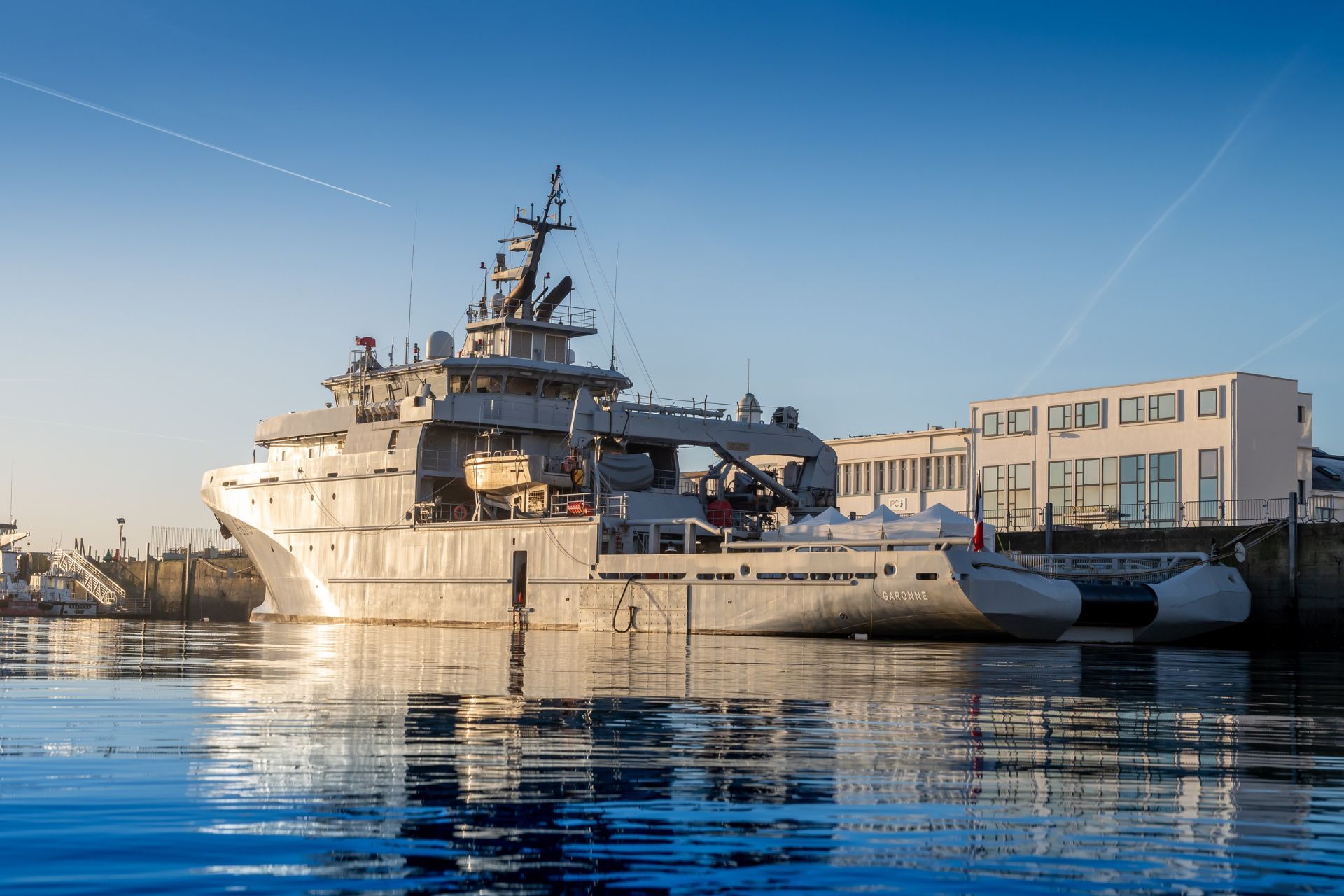 BSAM Garonne is a 70-meter-long vessel with a displacement of 2,950 tons, designed for force support, protection of people and assets, and maritime policing. It is equipped with two diesel engines, a crane, two 12.7 mm machine guns, multiple small boats, and has a towing capacity of 80 tons. The ship is built for versatility and modularity, allowing for the deployment of robotic systems. It is normally based in Brest, one of the two home ports for the four BSAM vessels currently in service with the French Navy.