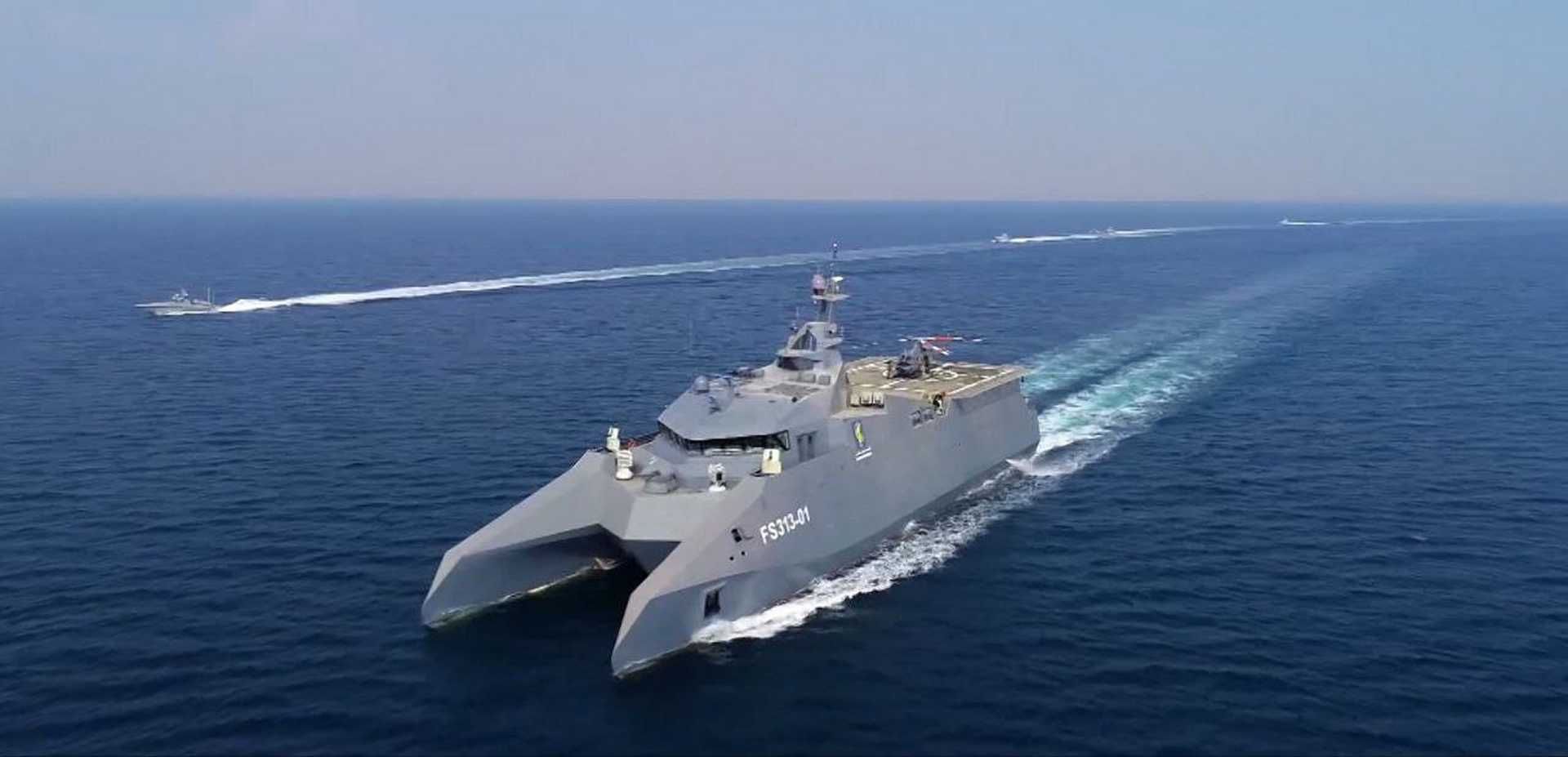 The Shahid Soleimani-class missile corvettes use aluminum hull construction to reduce weight and radar cross-section, and follow a catamaran layout with sharp angles intended to reduce detectability by radar systems. (Picture source: Iranian MoD)