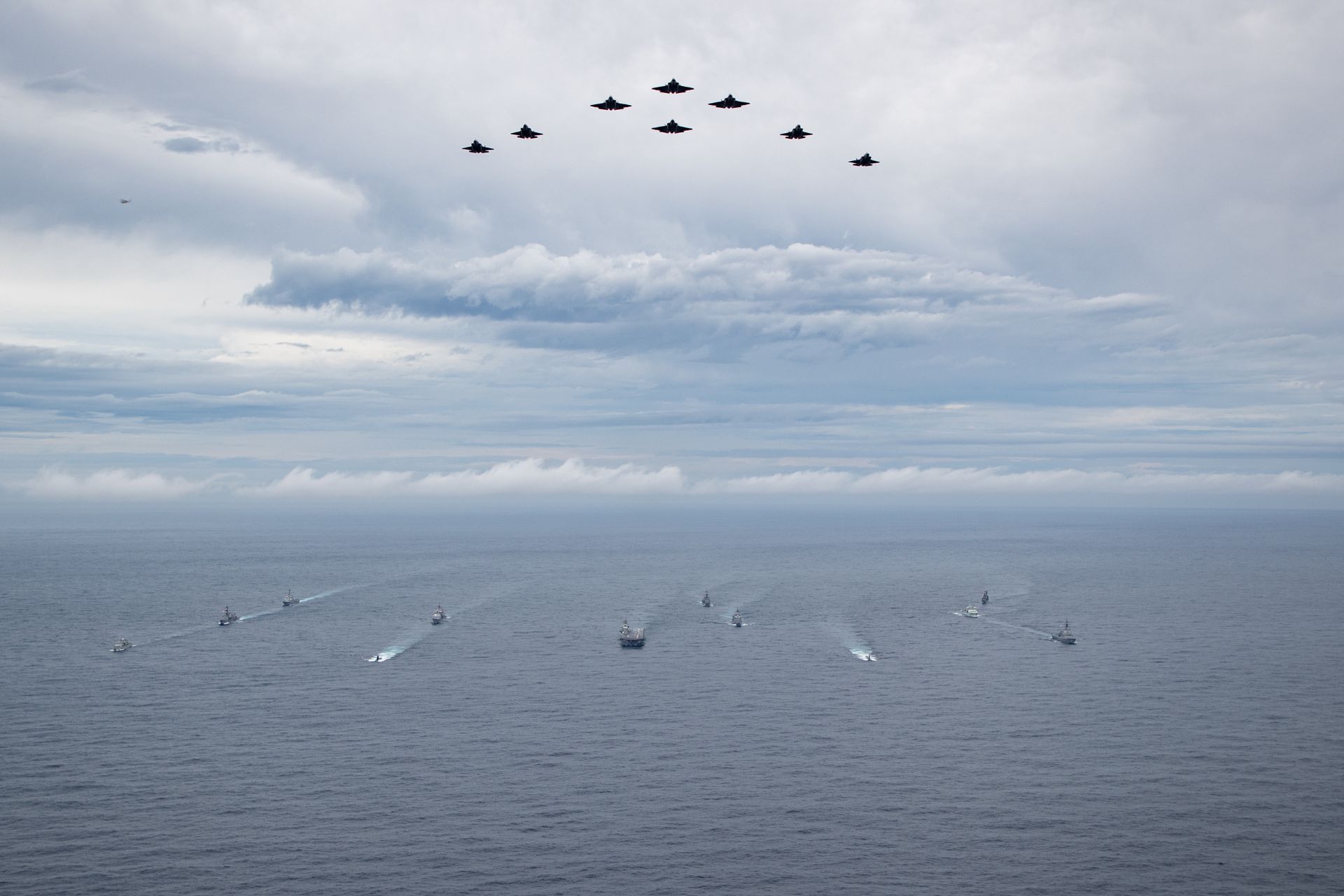 The force mix reflects an approach consistent with distributed maritime operations. A submarine conducts reconnaissance and sea denial. P-8As survey, classify, and develop tracks, then hand them to surface or air units best placed to intercept. Surface ships maintain air-defense umbrellas and hold long-range fires, while logistics vessels move under protection to refuel and resupply. When VMFA-242’s F-35Bs enter the cycle, they bridge the shore-sea seam, contribute to air control, and pass targeting data using sensor fusion, including under restricted radio conditions.