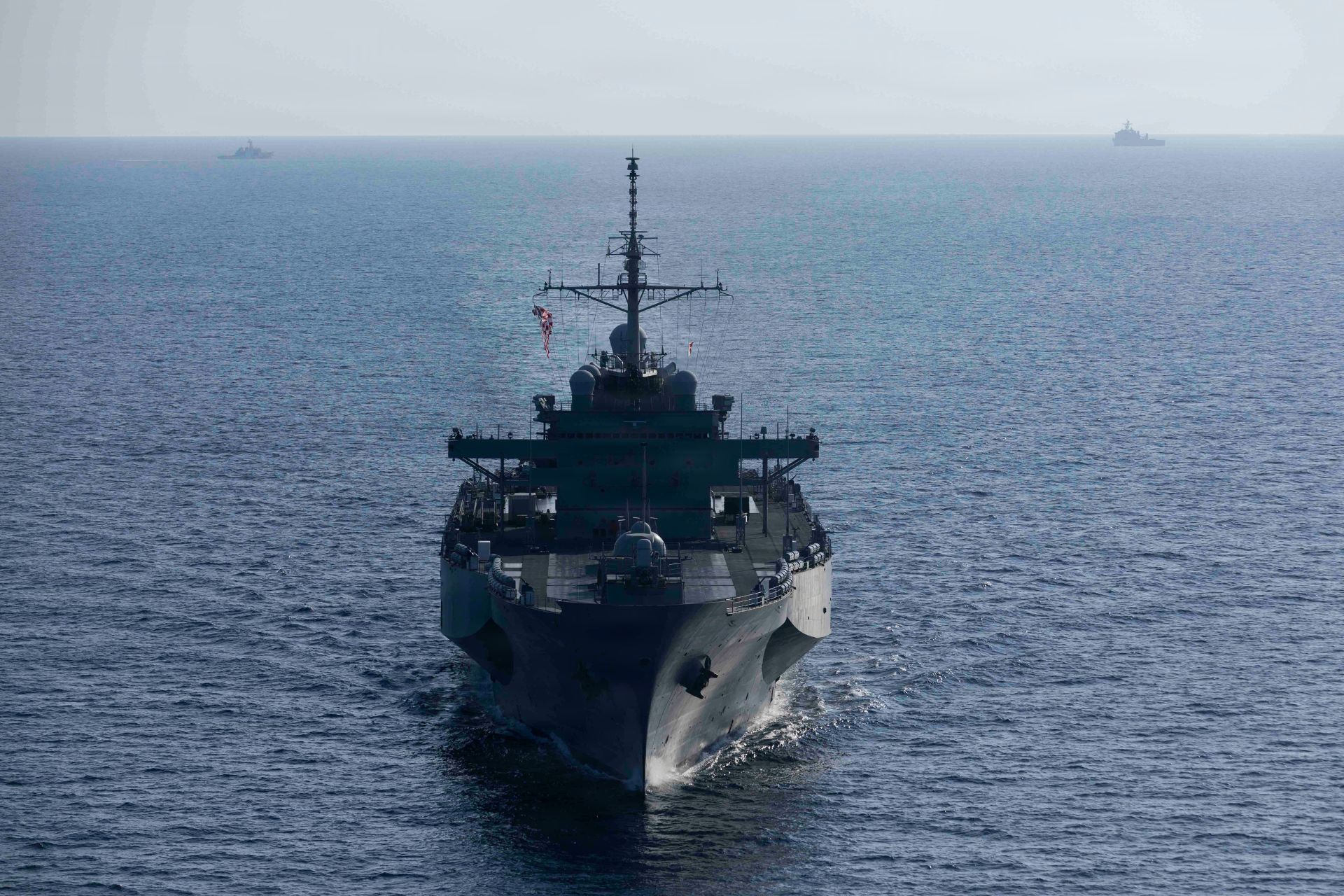 The first phase takes place in the South China Sea, where a multinational formation operates around USS Blue Ridge (LCC 19). This Blue Ridge-class amphibious command ship functions as a forward command node, integrating joint and combined forces through secure data links and satellite communications. Alongside it, the Philippine Coast Guard deploys the Teresa Magbanua-class patrol vessel BRP Melchora Aquino (MRRV 9702), while the Royal Australian Navy contributes the Anzac-class frigate HMAS Toowoomba (FFH 156), and the U.S. Navy operates the Whidbey Island-class dock landing ship USS Ashland (LSD 48).
