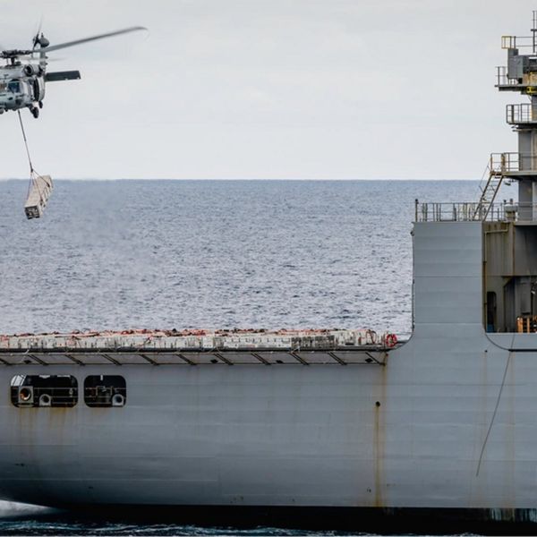 MH-60 Sierra Seahawk conducts ordnance replenishment for USS George Washington in Pacific Ocean